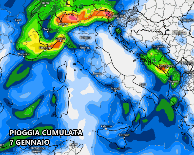 La perturbazione del 7 gennaio porterà piogge soprattutto sull’arco alpino e il Nord-Est, oltre che sul medio-alto Tirreno, mentre il resto d’Italia vedrà precipitazioni davvero molto esigue: