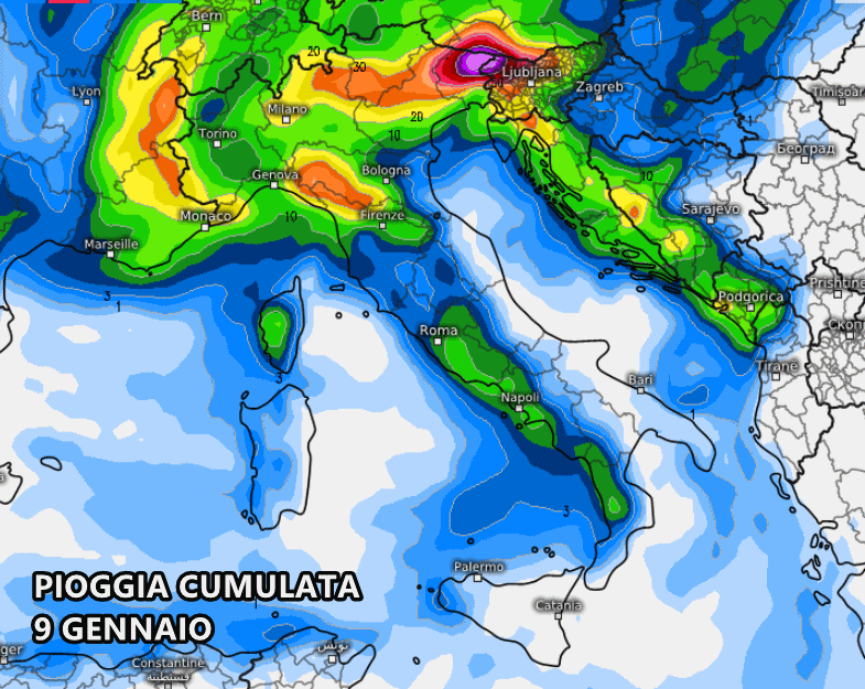 La successiva, ovvero la nota di maltempo del 9 gennaio, regalerà precipitazioni molto abbondanti al Nord, con picchi anche di oltre 100 mm sul Friuli Venezia Giulia. Piogge saranno presenti anche su gran parte del lato tirrenico, mentre sul medio-basso Adriatico e su gran parte del lato ionico, i fenomeni risulteranno molto più isolati e deboli.