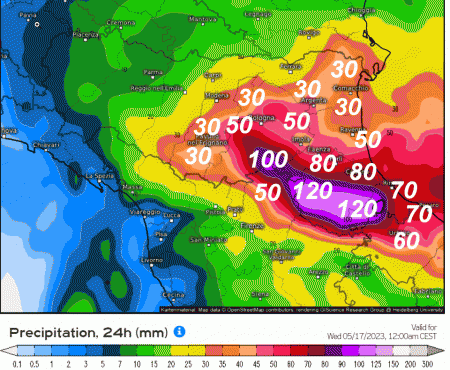 Facciamo chiarezza: non tutta l’Emilia Romagna verrà coinvolta da piogge intense. Il nocciolo pernicioso, con al suo interno precipitazioni superiori a 100mm nell’arco delle 24 ore interesserà soprattutto la fascia appenninica forlivese, bolognese ed imolese. Ovviamente le cumulate saranno elevate anche sull’immediata fascia pedecollinare e costiera, segnatamente sul Ravennate e il Riminese. Più ad ovest e più a nord, come si evince dalla mappa, pioverà, ma senza accumuli eccessivi.