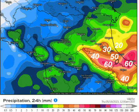 Le precipitazioni saranno ancora intense nella notte e al mattino, poi nel corso della giornata tenderanno lentamente a scemare. Interessata soprattutto la fascia orientale e costiera (Forlivese, Ravennate e Riminese) con ulteriori 60-70mm che si andranno ad aggiungere alle piogge cospicue del giorno precedente.