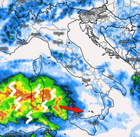Ecco il grappolo di temporali che metterà sotto torchio la Sardegna con fenomeni anche intensi. Sul resto d’Italia variabilità con ampie schiarite e forse qualche piovasco nelle aree interne del centro e sulle Alpi.