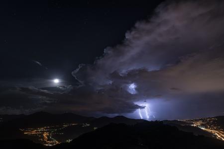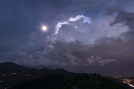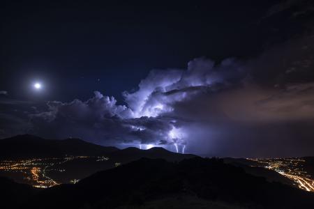 Queste fotografie sono state scattate poche ore fa dall’entroterra della Liguria, mostrano lo sviluppo di forti temporali lungo la linea di costa. Le immagini sono rese particolarmente suggestive dal fatto che i cumulonembi si trovavano in un contesto pulito, mancavano cioè le nubi accessorie che in situazioni depressionarie sono in grado di occultare completamente la visione del cumulonembo. In questi scatti la nube temporalesca appare completamente isolata e circoscritta. Tutto attorno il cielo appare sereno, le nubi illuminate dalla luce lunare.