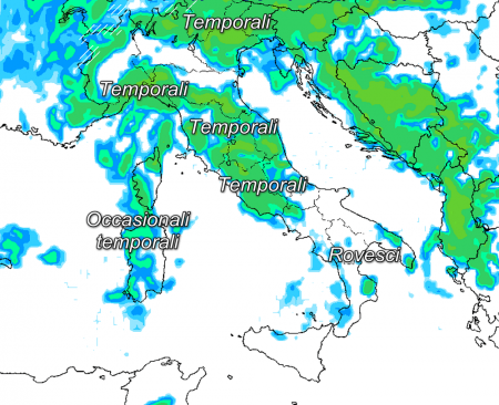 L’instabilità non è ancora finita qui; con l’arrivo della tarda mattinata e delle ore pomeridiane, la convezione si sposterà dal mare alla terraferma, il cielo sereno che nella notte ha dominato la scena lungo la fascia montuosa appenninica, verrà sostituito dalle nubi, mentre delle illusorie schiarite faranno capolino per qualche ora lungo le coste del medio ed alto Tirreno e sulla Valpadana, seguite a ruota da una probabile "ripresa" temporalesca nelle ore pomeridiane. Una stima delle precipitazioni previste nel pomeriggio odierno: