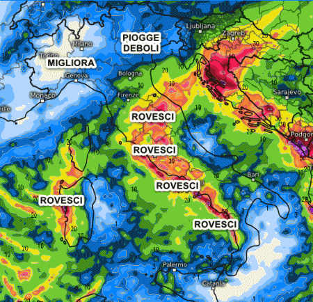 Tempo in miglioramento al nord e sull’alta Toscana, con le ultime piogge al nord-est in attenuazione. Maltempo invece tra la Sardegna, la bassa Toscana, l’Umbria, il Lazio, la Campania e la Calabria Tirrenica con rovesci e temporali anche forti. Fenomeni meno frequenti su Abruzzo, Molise ed estreme regioni meridionali.