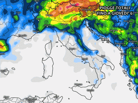 Analizzando la mappa degli accumuli di pioggia totali previsti fino a giovedì 6 Luglio, si evince un’evidentissima concentrazione di piogge sul Nordest. Gli accumuli totali potrebbero superare gli 80-90 mm su Trentino alto Adige, alto Veneto, Friuli. La differenza col versante tirrenico, il sud e le isole maggiori è decisamente importante: su questi settori i fenomeni saranno quasi del tutto inesistenti.