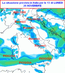 La prima mappa mostra le precipitazioni previste in Italia nelle ore centrali di lunedi 26 novembre.