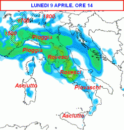 Nel pomeriggio (attorno alle ore 14), quasi tutto il nord e il centro saranno sotto piogge sparse, localmente a carattere di rovescio sulle regioni centrali. Le piogge si spingeranno fino alla Campania e forse alla Calabria tirrenica, mentre sulle due Isole maggiori e sulle estreme regioni meridionali il tempo resterà asciutto.
