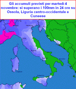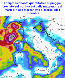 Si parla mediamente di almeno 110mm o anche 130mm per la sola giornata di martedì 4 novembre su Liguria centro-occidentale, ma soprattutto Imperiese, poi Ossola, basso Piemonte, Verbano, senza contare possibili temporali prefrontali nella giornata di lunedì 3 sulla Liguria, che da soli potrebbero localmente scaricare anche 80-100mm di pioggia in un paio d’ore.