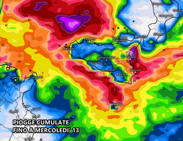 Nelle prossime 36 ore il maltempo raggiungerà l’apice in Sicilia, specie sul versante ionico, dove le correnti molto fresche da est potranno generare nubifragi stazionari. A pagarne le conseguenze saranno principalmente il basso messinese ionico e il catanese, dove si prevedono accumuli di pioggia molto importanti: