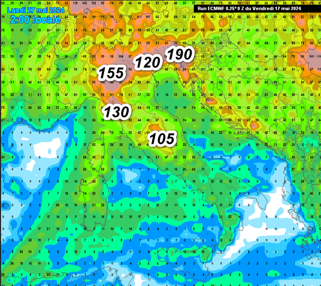 Il modello europeo è piuttosto pesante nella sua previsione per ciò che concerne il nord-est. Sul Friuli si prevedono fino a 190 mm, ma tra i 120 ed i 155 mm potrebbero cadere sulla pianura padano-veneta e sull’Appennino settentrionale; notevoli anche i 105mm nelle aree interne dell’Italia centrale.