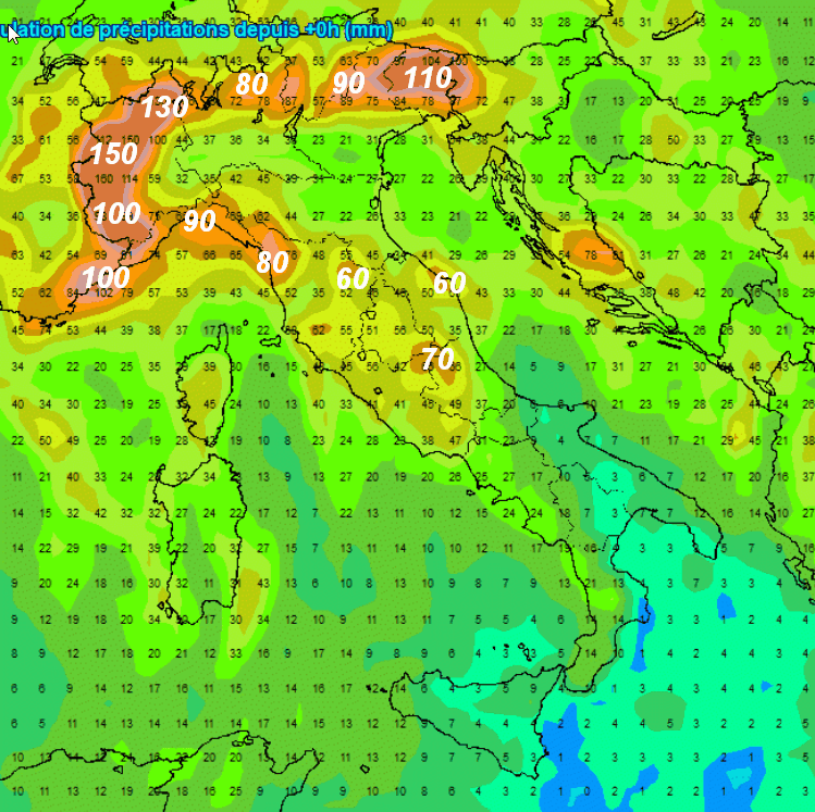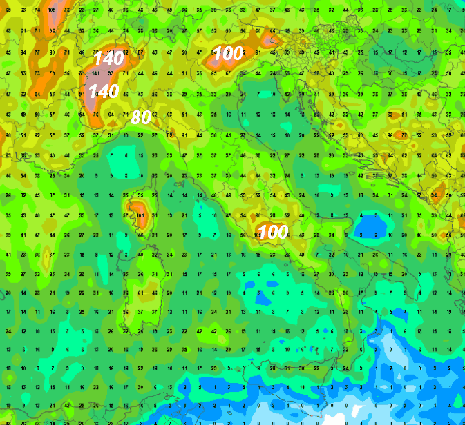 Notiamo precipitazioni attorno a 150 mm in prossimità delle Alpi occidentali (tanta neve in quota, ovviamente); 130 mm tra alto Piemonte e bassa Val d’Aosta, 110 mm sul Friuli, tra 80 e 100 mm lungo l’arco ligure, 80-90 mm sulle Prealpi Lombarde, 60-70 mm nelle aree interne dell’Italia centrale. Da notare come le estreme regioni meridionali, compresa la Sicilia, seguiteranno ad accumulare poco.