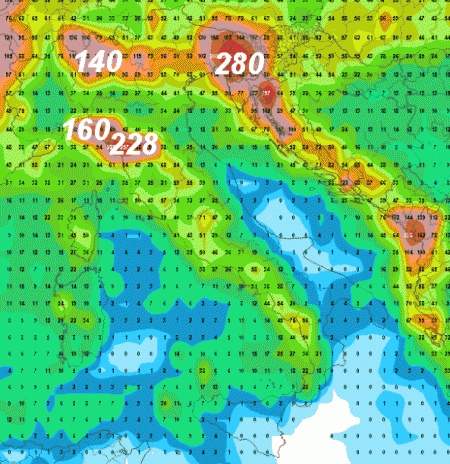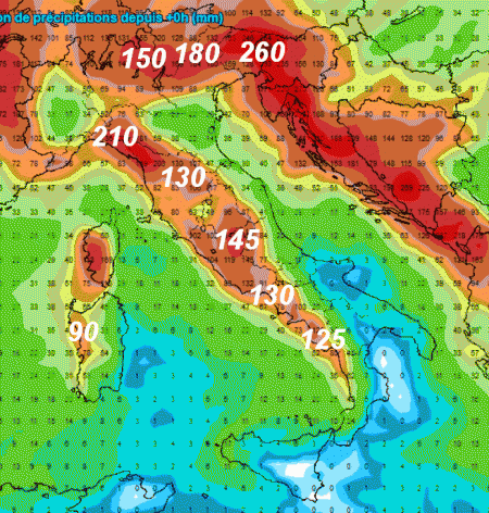 Come abbiamo anticipato, le piogge più intense si avranno nelle aree sopravvento al flusso sud-occidentale. 260mm sono attesi sul Friuli, 210mm nelle aree interne poste tra Ligura e Toscana, 145mm nelle zone interne del Lazio, 150-180mm sulla fascia prealpina lombardo-veneta, 130mm sull’Appennino Tosco-Emiliano e sulla Campania.