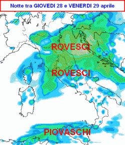 Per avere un passaggio piovoso degno di nota si dovrà aspettare la notte tra giovedì 28 e venerdì 29 aprile. Dalla cartina si nota un grappolo di piogge abbastanza consistenti abbracciare le regioni centrali, al limite fino all’Emilia Romagna.