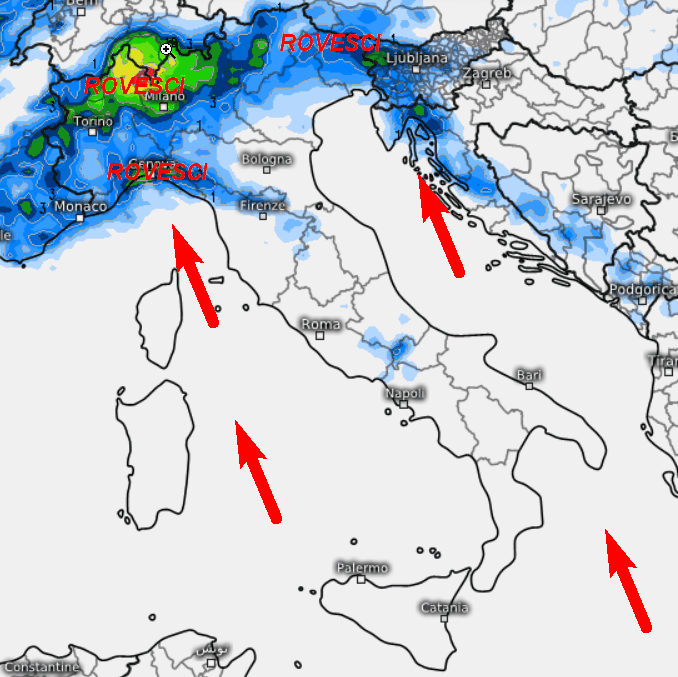 L’impatto dell’aria umida sui contrafforti montuosi alpini ed appenninici darà luogo ad acquazzoni nelle aree esposte a tale flusso, che avranno comunque carattere intermittente, ma potenzialmente intenso.
