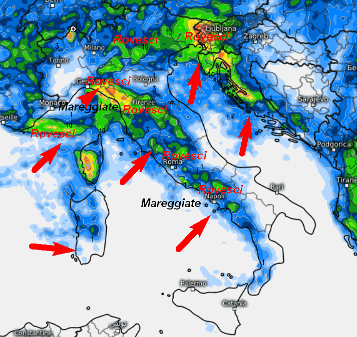 Acquazzoni saranno probabili sul settore ligure centro-orientale, soprattutto nelle aree interne. Rovesci intensi sulla Toscana, specie la parte settentrionale, oltre al nord-est, segnatamente sul Veneto orientale e il Friuli. Rovesci più sparsi anche sul restante versante tirrenico fino alla Campania ed alle retrostanti zone interne; qualche piovasco anche sulla Sardegna, per il resto tempo asciutto specie lungo il versante adriatico. Mareggiate saranno possibili lungo le coste liguri, dell’alta Toscana, sul basso Lazio, la Campania e forse la Calabria Tirrenica unitamente alla Sardegna occidentale. Temperature in generale aumento.