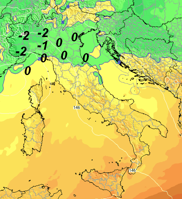Sulla verticale del nord-ovest si avranno isoterme alla medesima quota attorno a -2° con precipitazioni annesse. Questo la dice lunga sulla quota neve che potrebbe essere davvero bassa per il periodo. 0° a 1500 metri saranno comunque presenti anche sul resto del settentrione, mentre sul resto d’Italia si avranno temperature decisamente più elevate. LEGGI ANCHE: Lunedì NEVE sino a quote MOLTO BASSE al nord – MeteoLive.it