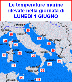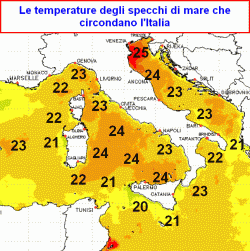 24° si registrano sul medio Adriatico e sul medio-basso Tirreno. 23° sul Mar Ligure, l’alto Tirreno, il basso Adriatico e parte del Mar Ionio. Gli altri specchi di mare presentano temperature inferiori, fino ad arrivare tra i 20 e i 21° dello Stretto di Sicilia.