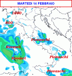 Prima dell’avvento di questa sorta di "Idillio climatico", la Sardegna riceverà ancora un po’ di pioggia nella giornata di martedì 14 febbraio. La mappa in alto a sinistra inquadra la situazione attesa per le ore centrali della giornata in parola.