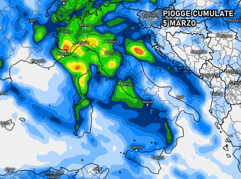 Di seguito le piogge previste nella giornata del 5 marzo, momento in cui dovrebbe irrompere la nuova perturbazione atlantica. Nord e medio-alto Tirreno come sempre, in questi casi, nel mirino delle piogge più sostanziose.