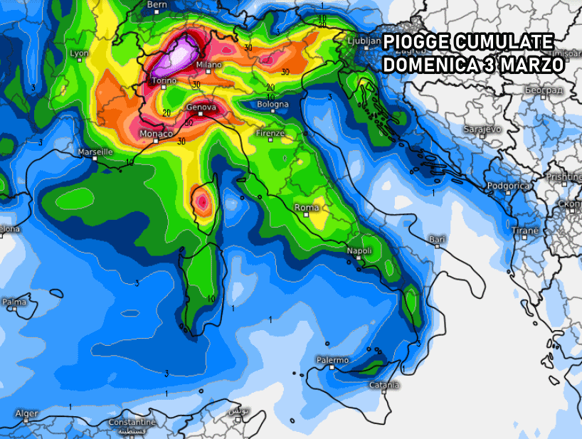 Nella sola giornata di domenica potrebbero scendere oltre 90-100 mm sull’alto Piemonte, fino a 40-60 mm sul resto del Nord-ovest. Spuntano piogge interessanti anche per il Triveneto ed il lato tirrenico. Lunedì 4 avremo le ultime piogge al sud.