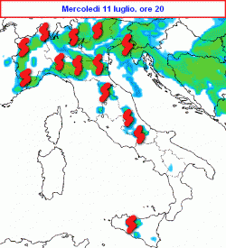 Alle ore 20 di mercoledì 11 luglio (seconda mappa), notiamo temporali sparsi su gran parte delle regioni settentrionali, ad eccezione forse della pianura piemontese e le coste liguri.