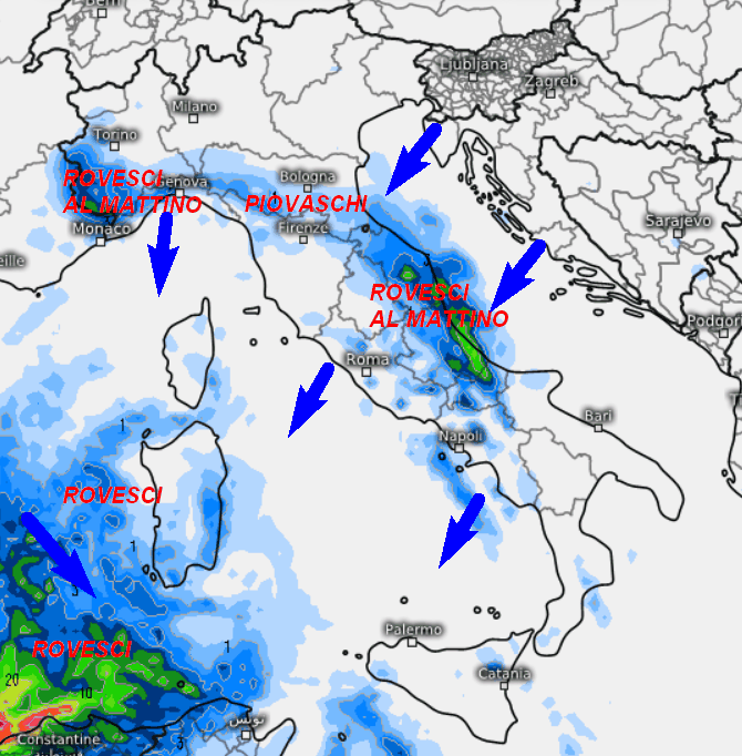 La seconda mappa mostra la sommatoria delle precipitazioni attese in Italia nell’arco della giornata di mercoledi 10 aprile:
