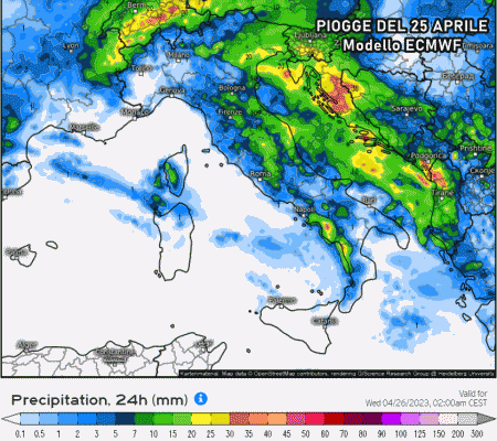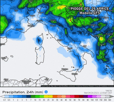 Le precipitazioni coinvolgerebbero dapprima il nord (principalmente il Nordest) al mattino, per poi estendersi anche al centro Italia e al sud tra pomeriggio e sera. Al mattino, pertanto, potrebbero esserci cieli sereni o poco nuvolosi su gran parte del centro e del sud in attesa del peggioramento nelle ore successive. Queste le piogge totali previste nel corso di martedì 25 dal modello americano GFS: