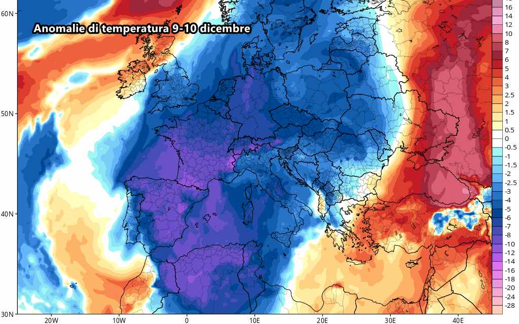 Il calo delle temperature sarebbe molto probabile e davvero molto ampio, come si evince dalle anomalie previste tra 9 e 10 Dicembre. Picchi di freddo specie su Francia e Spagna, con valori fino a 10-11°C sotto la media: