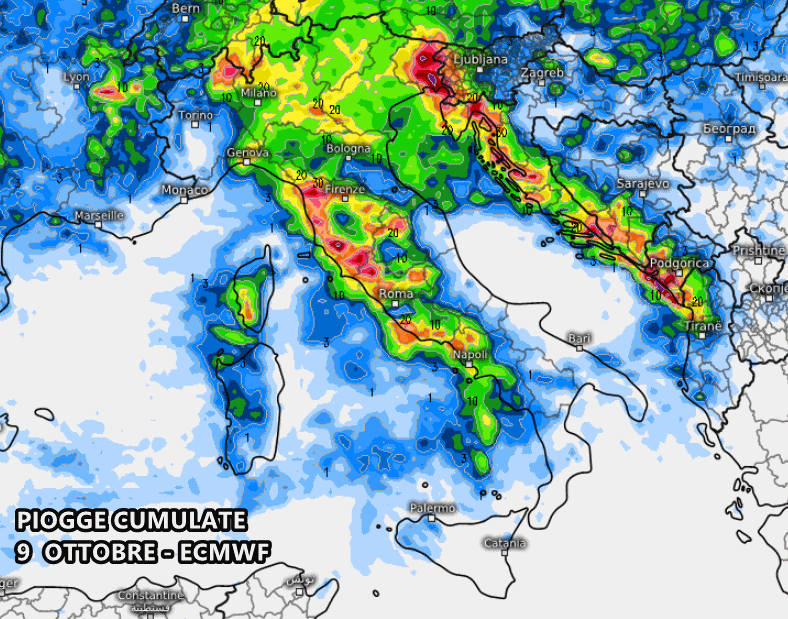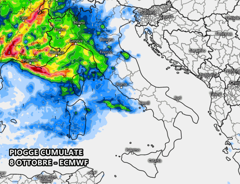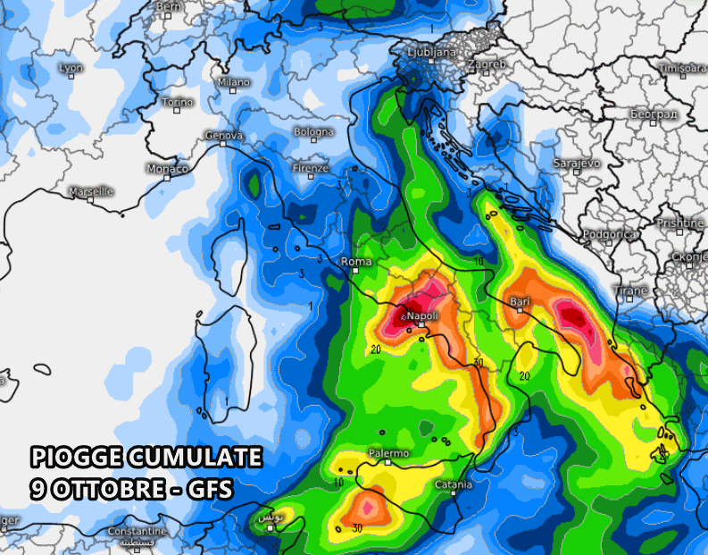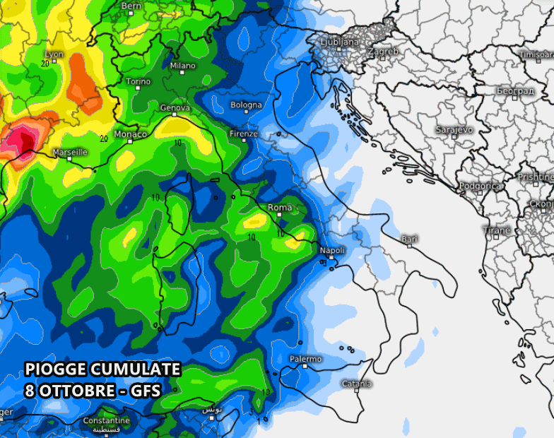 Il modello americano GFS mostra l’arrivo del fronte carico di pioggia tra pomeriggio e sera di martedì 8 ottobre, a partire dal Nord-ovest e dal medio-alto Tirreno: