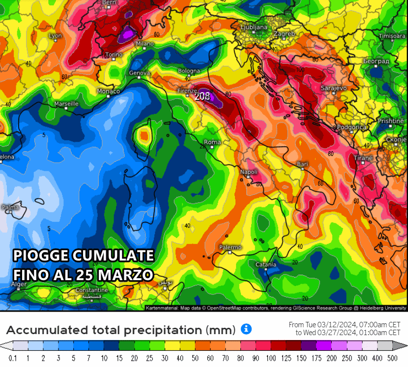Ma come abbiamo detto, il confine tra due situazioni opposte è molto sottile. Nel momento in cui la depressione iberica dovesse dirigersi più ad est, è chiaro che sarebbe l’Italia a fare i conti col maltempo intenso e nubifragi, mentre il caldo anomalo si sposterebbe su Balcani e Grecia (forse marginalmente al sud Italia). Era questo lo scenario paventato da GFS questa mattina, come si evince dalle piogge cumulate previste fino al 25 marzo: