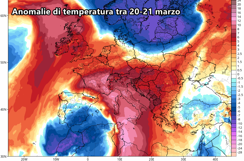 Difatti le anomalie previste tra 20 e 21 marzo sono davvero notevoli. Le temperature rischiano di salire di oltre 10°C rispetto alle medie del periodo, portandosi a conti fatti oltre i 24-25°C su diverse località specie al centro e al sud. Le anomalie negative affondano sull’Africa nord-occidentale, dove si piazzerebbe la depressione menzionata poc’anzi.