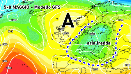 Ma l’aggiornamento del modello americano GFS propone non solo un avvio di Maggio perturbato, ma addirittura tutta la prima decade del mese all’insegna di rovesci, temporali e temperature sotto le medie del periodo. Un’evoluzione di questo tipo metterebbe a dura prova la Primavera, soprattutto nel periodo tra 5 e 8 Maggio. Il centro americano propone l’arrivo di aria fredda nord-orientale verso la nostra penisola, dove regalerebbe giorni decisamente più freddi del normale, oltre che parecchio instabili.
