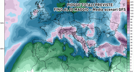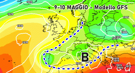 Ma non finisce qui, poiché GFS prosegue nella linea instabile determinata da altre depressioni in via di sviluppo nel Mediterraneo centrale. Anche 9 e 10 Maggio l’Italia potrebbe ricevere la visita di perturbazioni ricche di piogge e temporali.