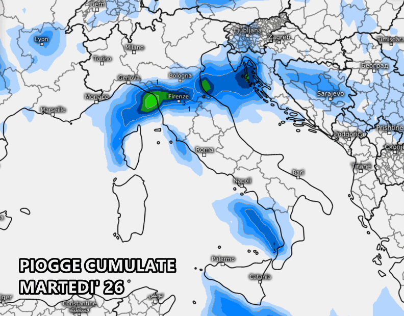 Nel corso di martedì 26 si prevedono piogge soprattutto su Liguria orientale e alta Toscana. Qualche pioggia anche in Romagna e bassa Calabria.