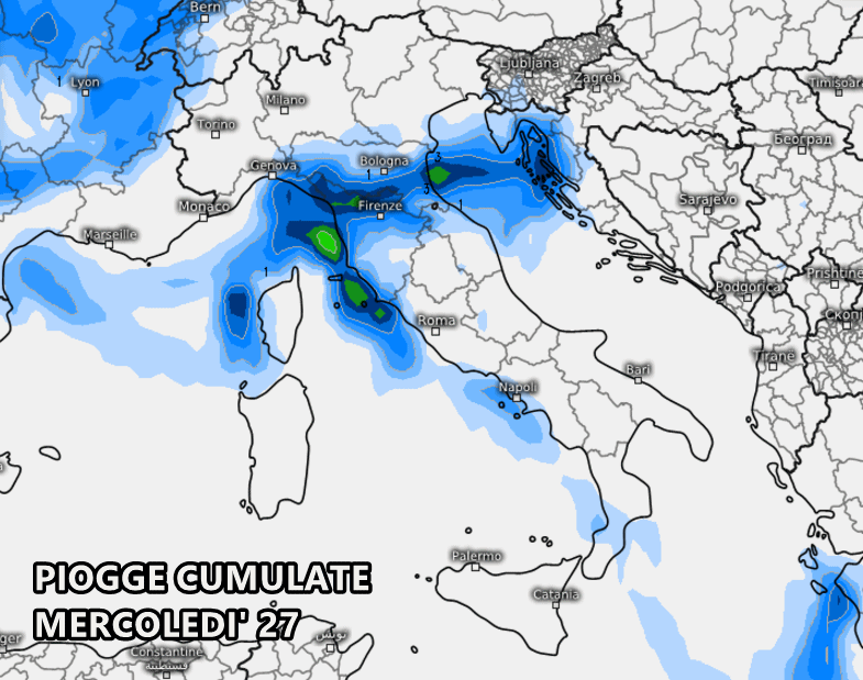 Discorso analogo anche nella giornata di mercoledì 27, con Liguria e Toscana in pole position per le precipitazioni più persistenti. Altrove avremo prevalenza di cieli poco nuvolosi o nuvolosi, specie al nord dove domineranno le nebbie.
