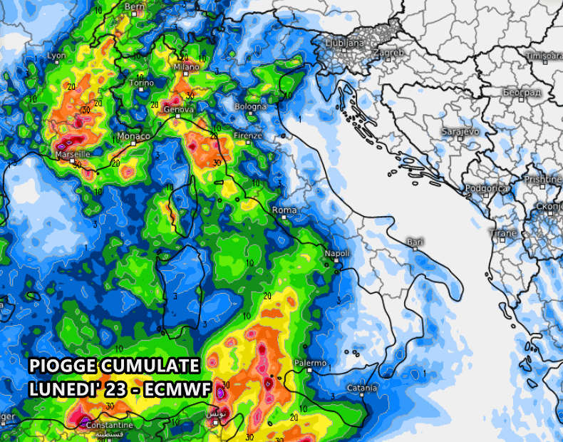 Il centro meteo europeo ECMWF è decisamente più prolifico: le piogge sarebbero ben diffuse già da lunedì su tutto il Nordovest, le isole maggiori ed il medio-alto Tirreno, con accumuli localmente superiori ai 40 mm.