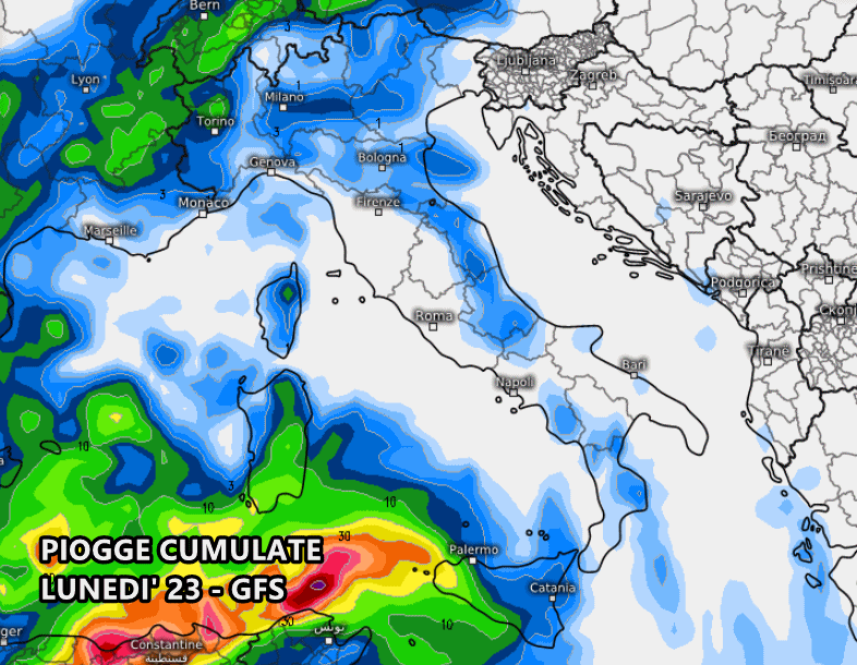 I primi fenomeni di questa nuova perturbazione potrebbero approdare in Italia nel corso di lunedì 23, a cominciare dalle isole maggiori. Piogge deboli, secondo il modello americano, al nord e a sprazzi sul medio Adriatico.
