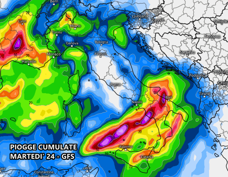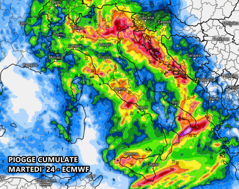Il maltempo entrerebbe nel vivo martedì 24 su tutto il sud, anche con un marcato rischio di forti temporali e locali nubifragi. Fenomeni diffusi anche al nord, mentre le regioni centrali vedrebbero piogge più sporadiche.