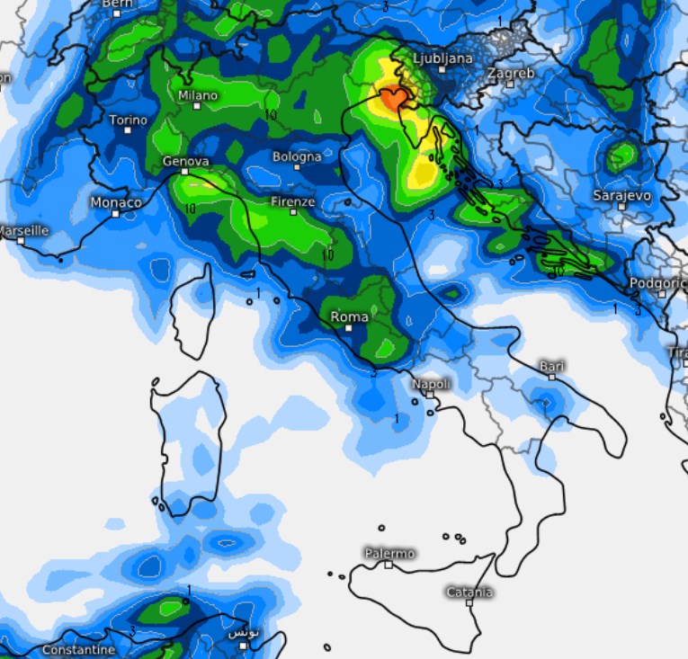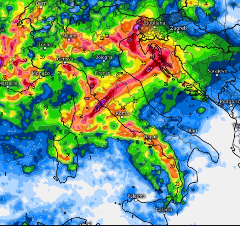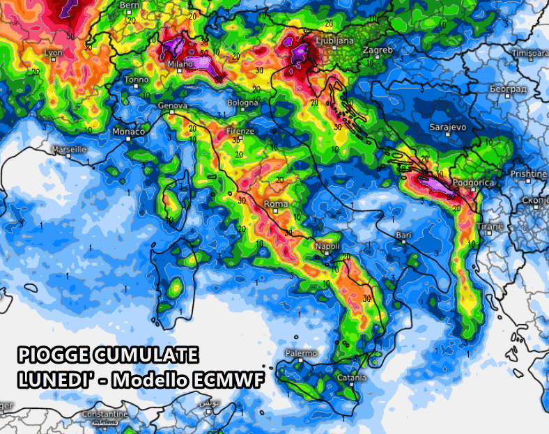 Anche l’Europeo ECMWF mostra un inizio di settimana, la prossima, pregno di pioggia per tante regioni da nord a sud. Spuntano picchi pluviometrici superiori ai 100 mm in Lombardia e Friuli Venezia Giulia.