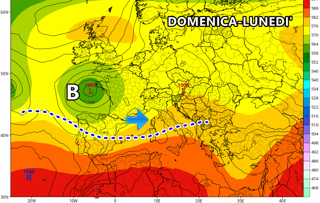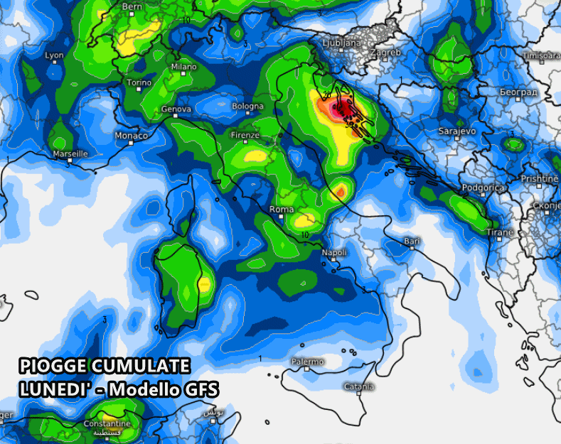 Nonostante gli ultimi “ritocchi” verso ovest della perturbazione, le piogge non dovrebbero mancare su gran parte d’Italia. Il modello americano GFS mostra il peggioramento già da domenica al nord, con piogge più presenti in Liguria, Pianura Padana e alta Toscana, oltre che sul Lazio: