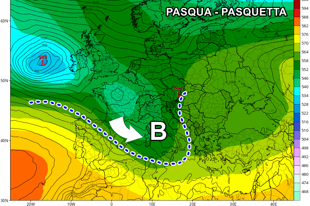 Il maltempo però non mollerà facilmente la presa e si ripresenterà sulla nostra penisola nel giorno di Pasqua. Arriverà un’altra perturbazione di stampo atlantico, che ripercorrerà le orme delle precedenti perturbazioni e pertanto riproporrà la pioggia prima al Nord-Ovest, sulla Sardegna, poi sul Nord-Est e gran parte del Centro Italia nel corso della domenica di Pasqua.