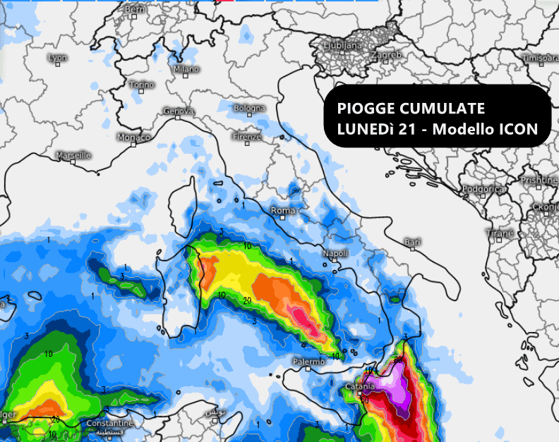 Le difficoltà previsionali riguardo la distribuzione dei fenomeni e la loro intensità è molto evidente osservando gli altri centri di calcolo. Ad esempio il modello ICON mostra, per la giornata di lunedì, piogge e nubifragi sulle coste del messinese ionico, del catanese e sulla Calabria meridionale (con picchi di oltre 200 mm):