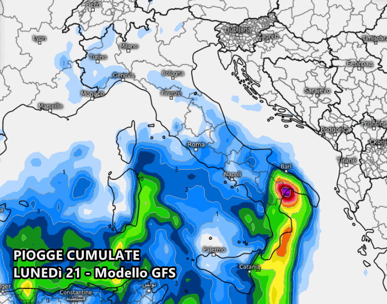 Lunedì 21 Ottobre il ciclone resterà immobilizzato nei pressi della Sicilia, favorendo la risalita costante di aria umida e tiepida (ovvero venti di scirocco) dal basso Ionio verso le coste di Puglia, Basilicata, Calabria e Sicilia orientale. Tutta questa umidità si tramuterà in pioggia, con elevato rischio di fenomeni persistenti per tutto il giorno tra tarantino, metapontino, cosentino, crotonese, catanzarese, reggino ionico.