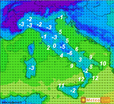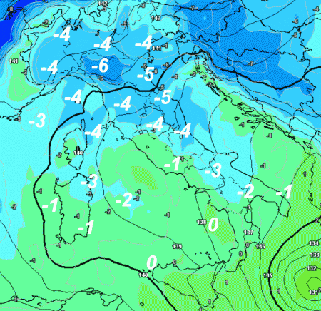 Al settentrione, le isoterme alla medesima quota si prevedono ampiamente negative e comprese tra -4 e -6°. Valori negativi anche al centro e compresi tra i -4/-5° delle aree interne – il versante adriatico ed i -1/-3° della Sardegna e il versante tirrenico. Al sud temperature comprese tra -3-4° a 1500 metri su Molise e Puglia Garganica e 0°/+ 1° delle estreme regioni meridionali.