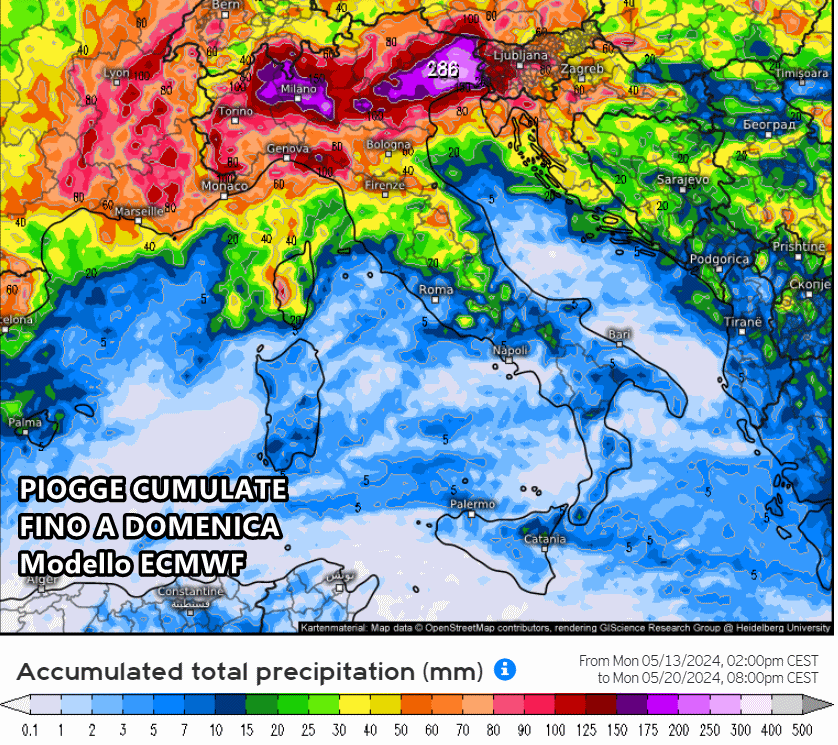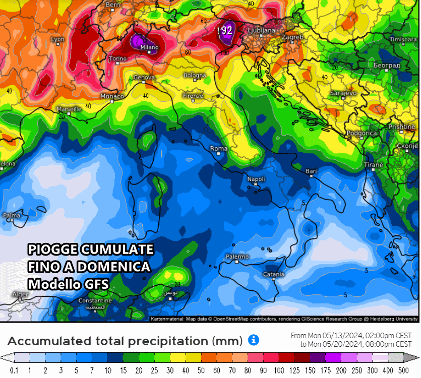 Anche il modello americano GFS mostra piogge molto abbondanti su tutto il Nord Italia, mentre man mano che ci muoviamo verso sud gli accumuli diventano via via sempre più scarsi e relegati alle aree interne e montuose.