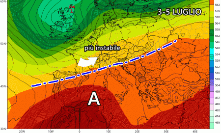 Tra sabato sera e domenica ci sarà una momentanea pausa al nord, ma a quanto pare la situazione degenererà nuovamente ad inizio prossima settimana. Tra 3 e 5 Luglio il tempo peggiorerà nuovamente al nord grazie ad un costante flusso fresco alle alte quote che soffierà senza freni sul nord Italia. Il resto d’Italia, invece, riceverà la visita dell’alta pressione.