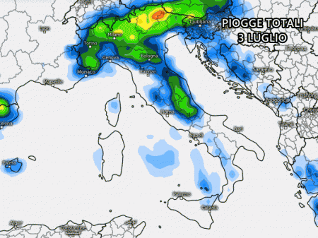 Qui sopra possiamo osservare le precipitazioni previste lunedì 3 Luglio, quasi interamente concentrate al nord. Fenomeni più consistenti su Trentino alto Adige, alto Veneto, Lombardia, alto Piemonte, Emilia.