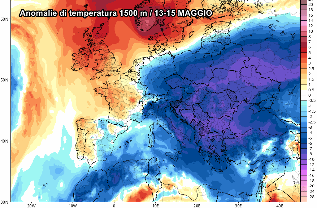 Il modello americano GFS ci mostra anomalie di temperatura davvero ragguardevoli per quanto riguarda il periodo tra il 13 e il 15 maggio. La colonnina di mercurio potrebbe scendere di almeno 8 o 10 ° al di sotto delle medie del periodo sui Balcani e anche sulle regioni adriatiche. Ricordiamo che questa mappa si riferisce alle anomalie di temperatura a 1500 m di altitudine in libera atmosfera, ragion per cui al suolo è chiaro che l’influenza del Sole avrà un impatto diverso e le temperature non saranno così basse come in alta quota.
