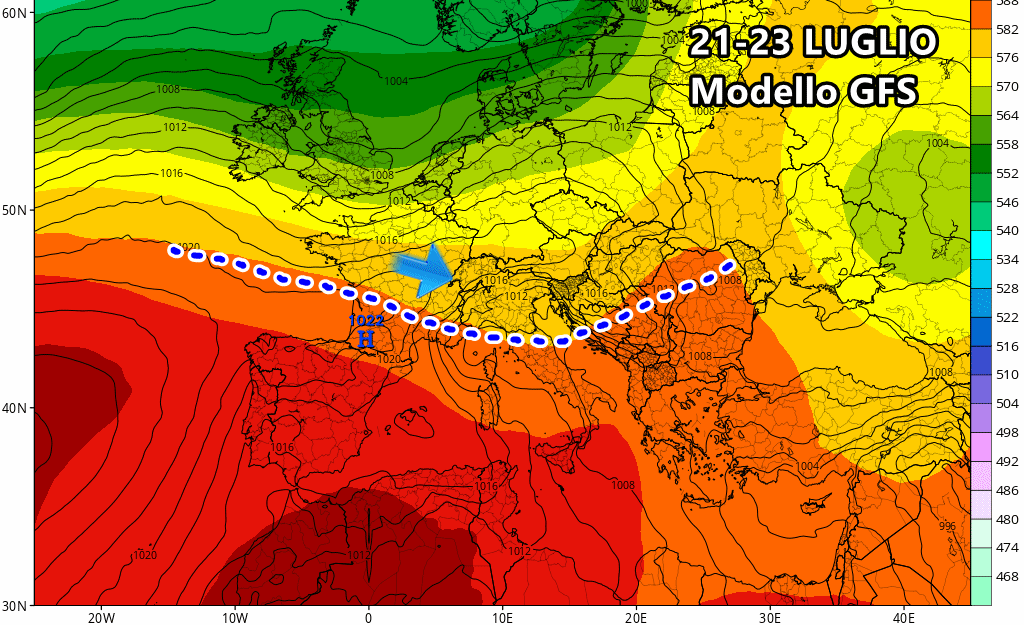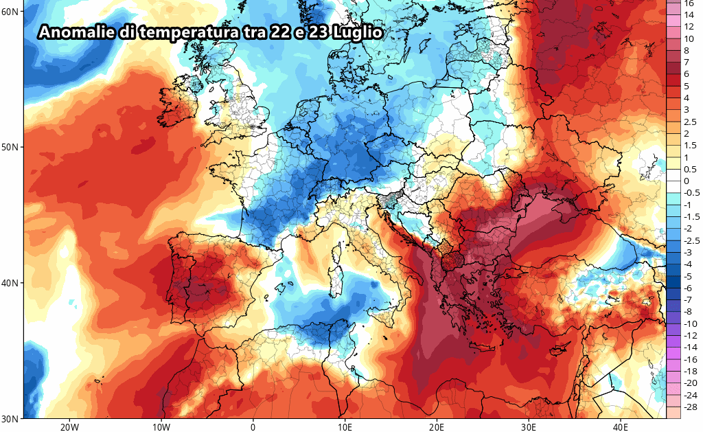 Come si evince dalle anomalie previste tra il 22 e il 23 luglio, il calo termico potrebbe riguardare buona parte dello stivale, riportando la colonnina di mercurio quantomeno nelle medie tipiche del periodo. Tuttavia, dobbiamo specificare che potrebbe trattarsi solo di una toccata e fuga di quest’aria più gradevole, considerando che gli ultimi giorni del mese potrebbero vedere la pronta ripresa dell’anticiclone africano su tutto il Mediterraneo.