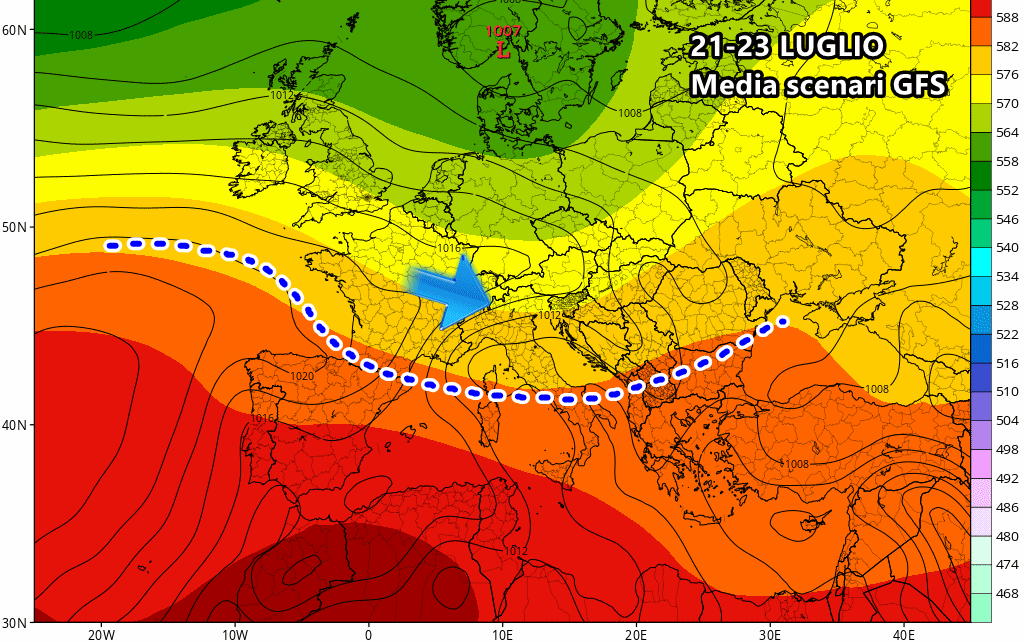Anche la media degli scenari del modello americano GFS concorda con questa ipotetica discesa di aria più gradevole proveniente dal Nord Atlantico, a cominciare dal Nord Italia.
